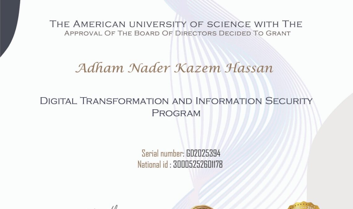 gd2025394 June 18, 2025 58 0 Certificate first Name : adham Last Name : nader kazem hassan Serial Number : GD2025394 Nationality : Egyptian